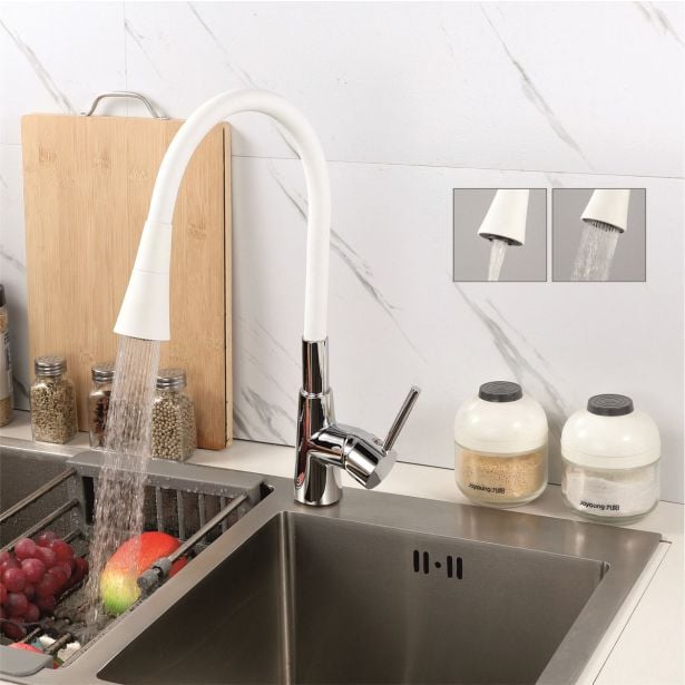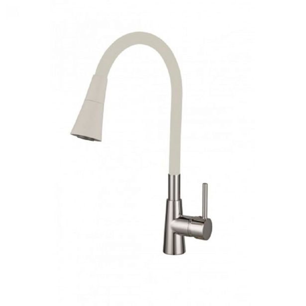 Eleganten videz združuje kromirano površino z mat belimi detajli, kar ustvarja moderen in prefinjen dodatek k notranjosti vsake kuhinje. Fleksibilna bela cev nudi popolno prilagodljivost, saj omogoča enostavno premikanje in usmerjanje vodnega curka točno tam, kjer je potrebno, ne glede na to, ali pomivate posodo, pripravljate hrano ali čistite pomivalno korito.