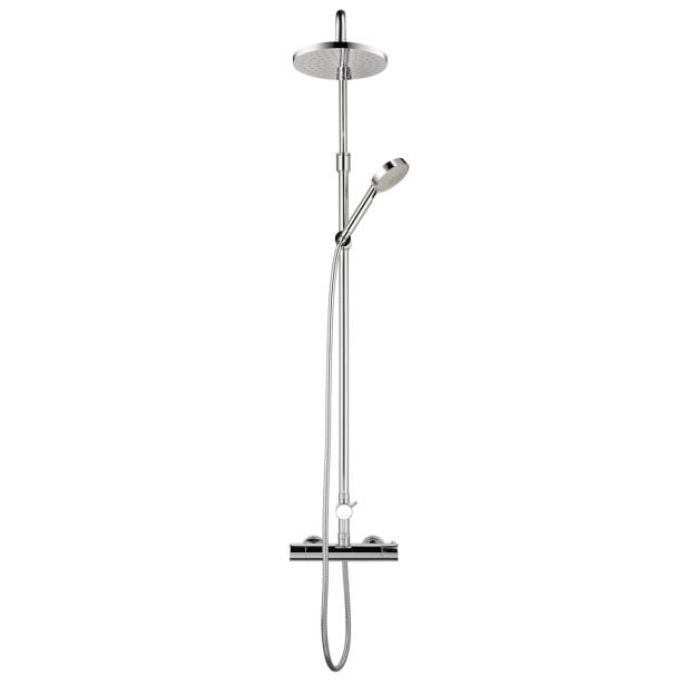 Sestava za prho za stensko montažo s termostatsko mešalno armaturo, okroglo nadglavno prho, konzolo in tuš ročko.