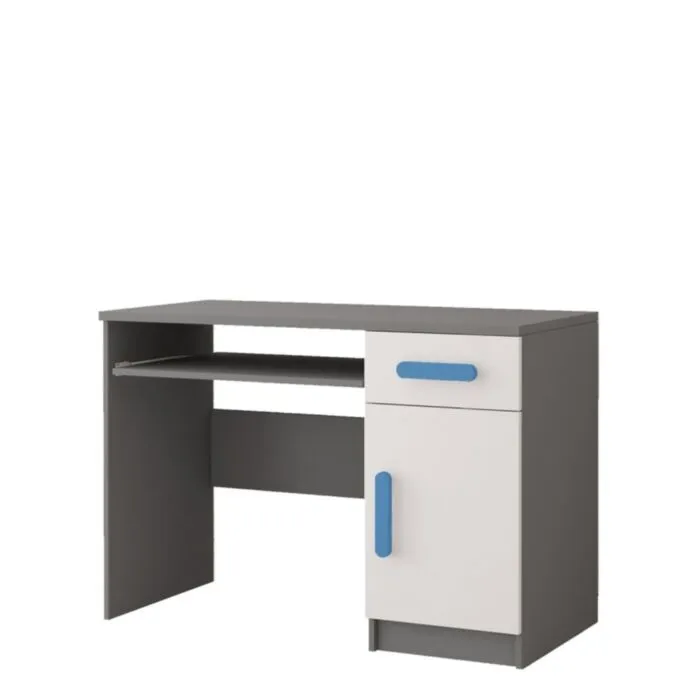 Pisalna miza LIVIJA 2 je primerna za vse mladinske in otroške sobe. Miza je narejena iz laminirane plošče debeline 16mm z ABS robovi, ročaji so leseni. Miza je dobavljiva v sivi barvi, fronta je v beli barvi in ročaji so modri.