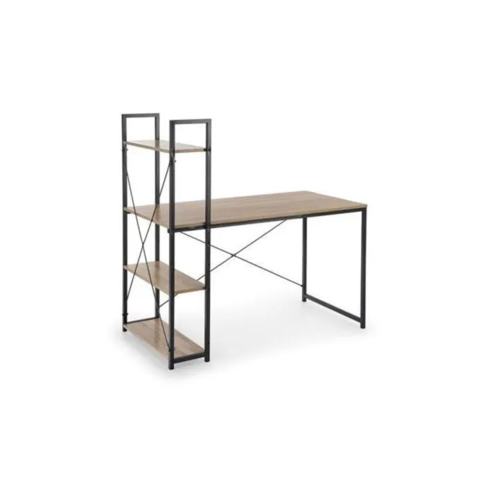 Pisarniška miza BELAS – črna, je moderna in praktična miza, izdelana iz iverne plošče in kovine, v barvni kombinaciji sonoma hrasta in črne. Opremljena je z regalom oz. policami, ki nudijo dodaten prostor za shranjevanje in organizacijo. Njena elegantna zasnova je idealna za vsak delovni prostor ali domači kotiček, saj združuje funkcionalnost in stil.