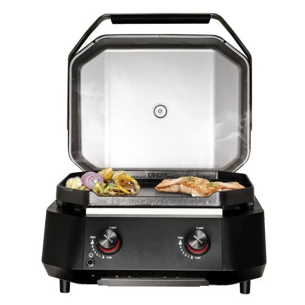 Plancha G-500 iz Cozzeja z 2 gorilnikoma in 2 reverzibilnima ploščama z gladko in rebrasto površino. Plancha vam ponuja drugačne možnosti kuhanja od tistih, ki jih dobite z običajnim električnim žarom in rešetko za žar.