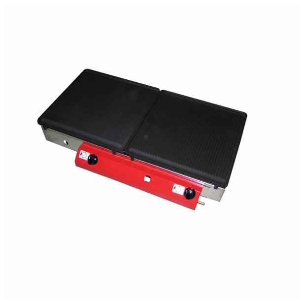 Za 8-14 oseb, površina za pečenje (d/š): litoželezna gladka plošča 40/40 cm + litoželezna rebrasta plošča 40/40 cm, 2 S gorilnika, moč: 2 x 5 kW = 10 kW, velikost izdelka (šxgxv): 79/47/15 cm, priključek: smrekica fi 8 mm, teža: 19 kg.