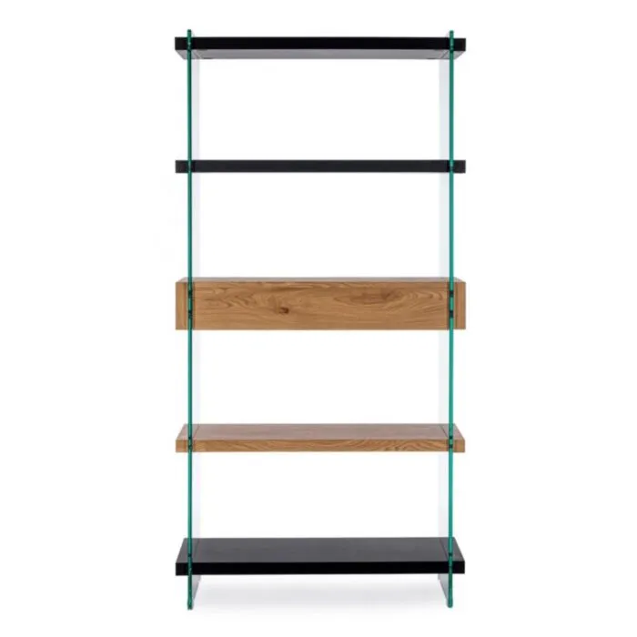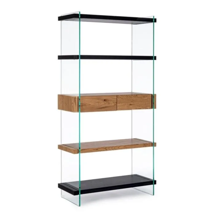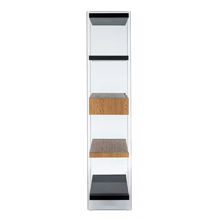Poličnik LINE WOOD je dobavljiv v črno-rjavi barvi. Sestavljen je iz kaljenega stekla debeline 12mm. Police so iz MDF plošče- videz lesa.