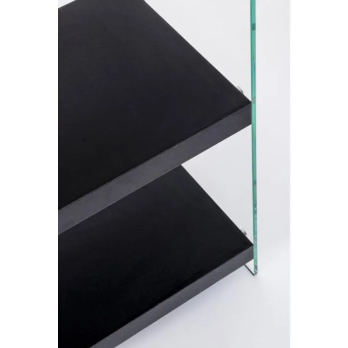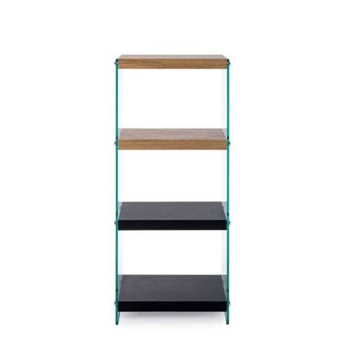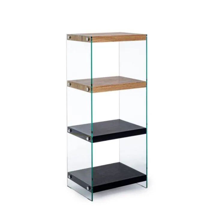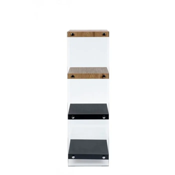 Poličnik LINE WOOD je dobavljiv v rjavo-črni barvi. Stranice so iz kaljenega stekla (12mm), police pa so iz MDF plošč (videz lesa).