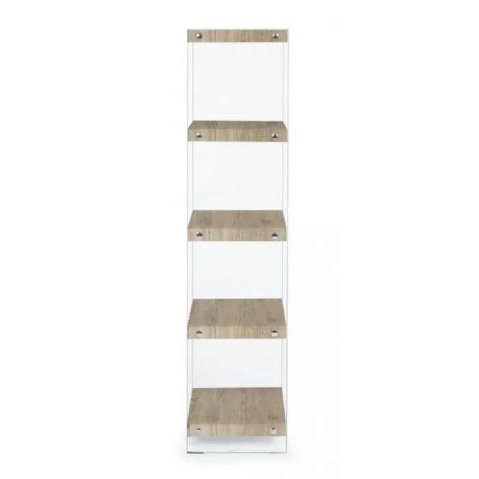 Poličnik KENYA je dobavljiv v natur barvi lesa. Stranice so iz kaljenega stekla (12mm), police pa so iz MDF plošč (videz lesa).