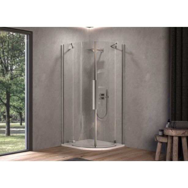Polkrožna tuš kabina Polaris s Silver brill profili, kaljenim prozornim steklom debeline 8/6 mm, Clean coat zaščitnim premazom. Radij 55 cm. Vhodna odprtina 77,5 cm.