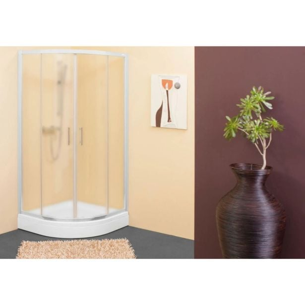 Polkrožna tuš kabina s snemljivimi vratnimi krili na krogličnih ležajih, ki omogočajo lažje čiščenje. Kotna postavitev, kaljeno Chincilla steklo debeline 5/6 mm, srebrni profili, zapiranje z magnetnim profilom, vhodna odprtina 52 cm, radij 55 cm.