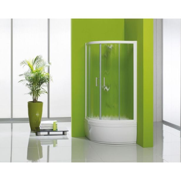 Polkrožna tuš kabina, s snemljivi vratni krili na krogličnih ležajih, ki omogočajo lažje čiščenje. Kotna postavitev. Beli profili. Zapiranje z magnetnim profilom. Debelina stekla 5/6 mm.