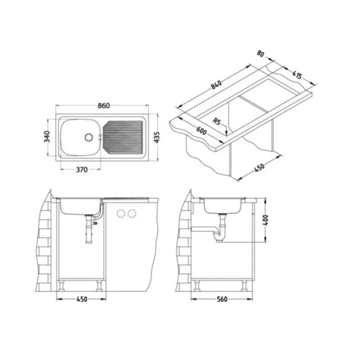 Inox pomivalno korito B60 je vgradno. Korito ima eno posodo in odlagalno površino. Postavitev korita je univerzalna (levo ali desno). Minimalna širina omarice je 45 cm. Velikost posode je 34 x 37 x 14,5.