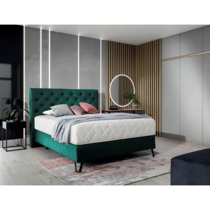 Postelja KORI je narejena iz robustnega okvirja s črnimi kovinskimi nogami višine 15cm. Prešito zglavje je polnjeno s peno, ki zagotavlja mehko oporo za glavo. V kompletu s posteljo dobite udobno vzmetnico z žepkastimi vzmetmi. Vzmetnica ima snemljivo prevleko.