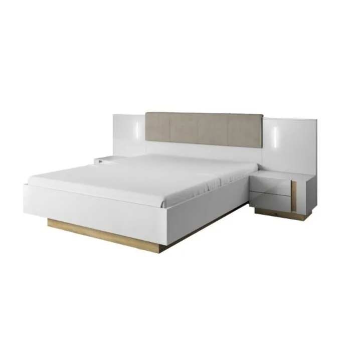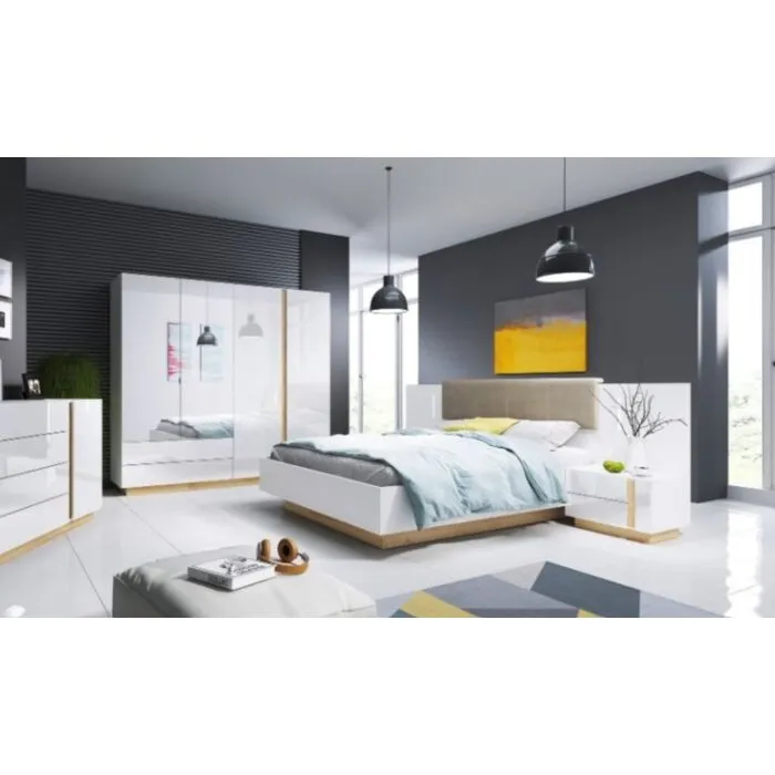 Elegantna in moderna postelja NANCY je narejena iz odličnih materialov. Edinstvena postelja NANCY bo vaši spalnici dala sodoben in eleganten videz. Vse to zahvaljujoč sijočim belim frontam, ki jih prekinja kontrastni hrastov poudarek. Minimalistične oblike bodo našle svoje mesto v različnih aranžmanjih. Postelja ima posodo za shranjevanje posteljnine in ABS robove, ki zagotavljajo večjo odpornost proti udarcem, vlagi in obrabi ter podaljšujejo njeno življenjsko dobo. ABS robovi ne le ščitijo pred poškodbami, ampak poskrbijo tudi za lepši in elegantnejši videz pohištva.