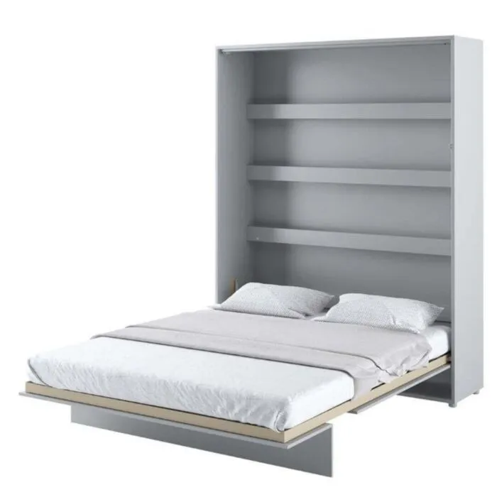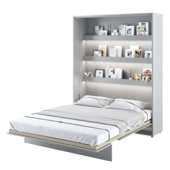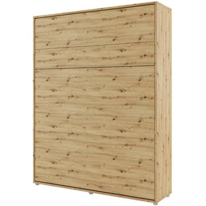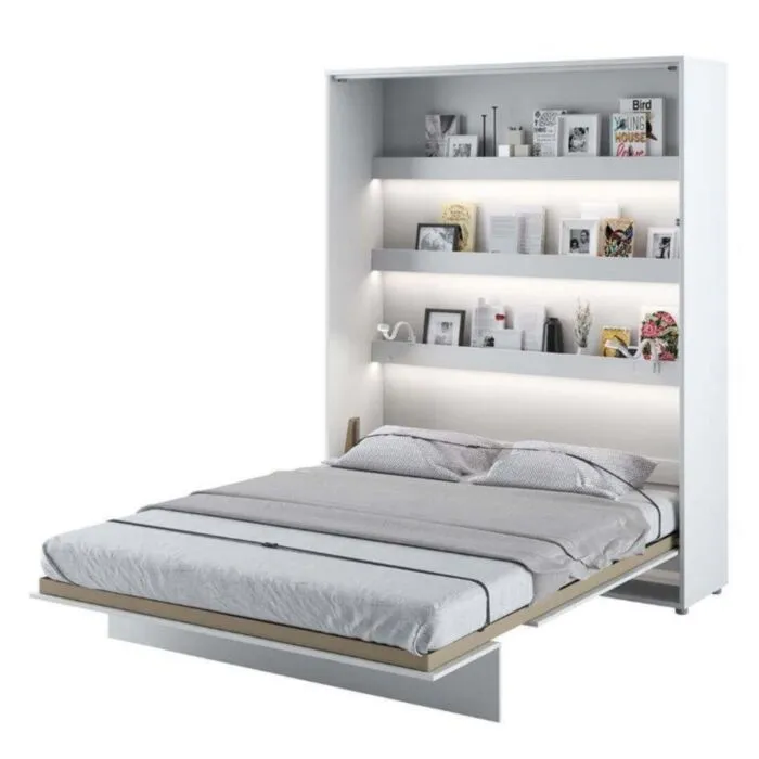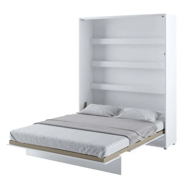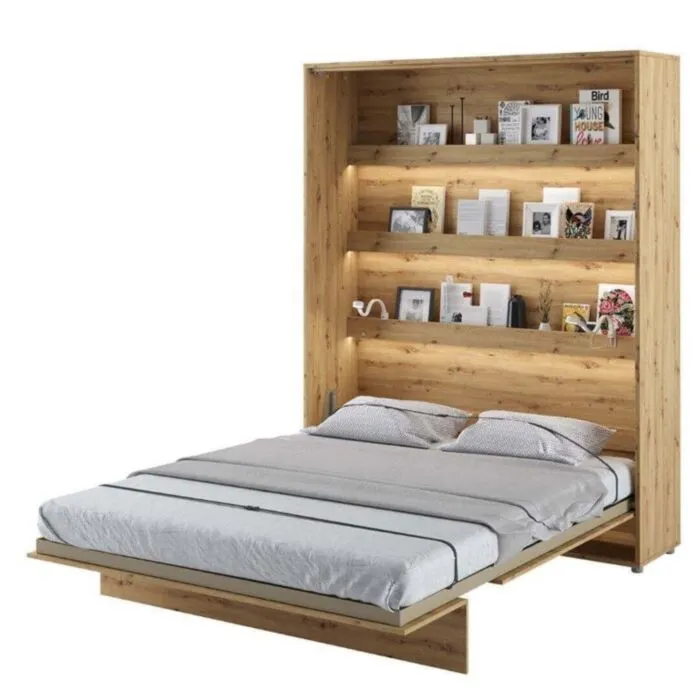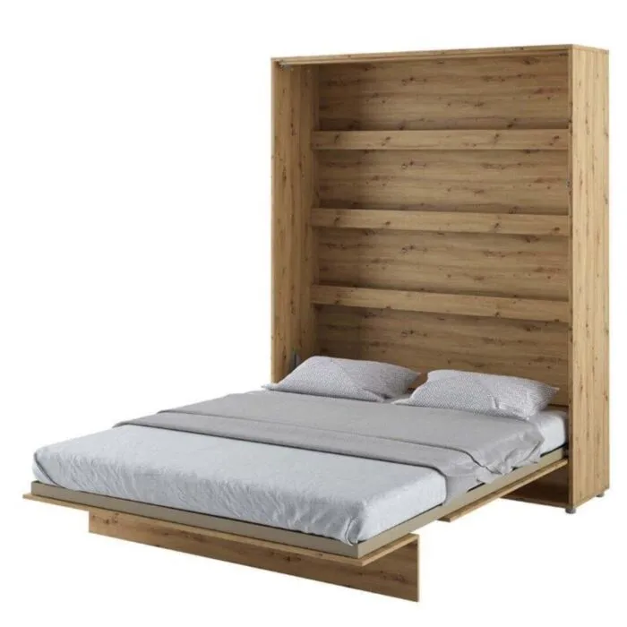 Navpična stenska postelja METULJ je primerna za vzmetnico 160 cm širine. Opremljena je z dodatnimi notranjimi policami. Primerna je tudi za majhno stanovanje, sobo za goste, garsonjero itd. Stenska postelja je enako udobna kot klasična postelja – Ima letveni pod ter trpežen kovinski okvir in stabilizator vzmetnice, ki zagotavlja udoben počitek. Pnevmatsko dvigalo preprečuje nenadno odpiranje postelje. Postelja se odpre s klikom na sprednji strani in se jo nežno povleče dol. Ker ima postelja soft close je zapiranje postelje skoraj neslišno. Za shranjevanje posteljnine ne potrebujete dodatnega prostora, saj je opremljena s praktičnimi posteljnimi trakovi, zahvaljujoč katerim odeja in vzglavniki izginejo skupaj s posteljo. Nosilni mehanizem in posteljni okvir sta izdelana iz kovine, kar neposredno vpliva na njihovo visoko vzdržljivost.