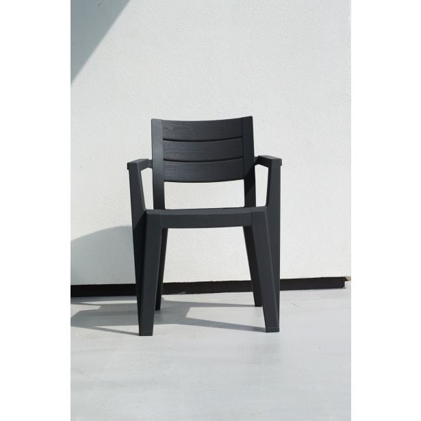 Udoben dizajn, primeren za različne stile in oblike miz, možnost zlaganja v skladovnico, so glavne prednosti udobnega stola Julie. Enostavno čiščenje, brez vzdrževanja in dodatne zaščite pred slabimi vremenskimi razmerami. Dimenzije 61,5 x 58,5 x 79 cm.
