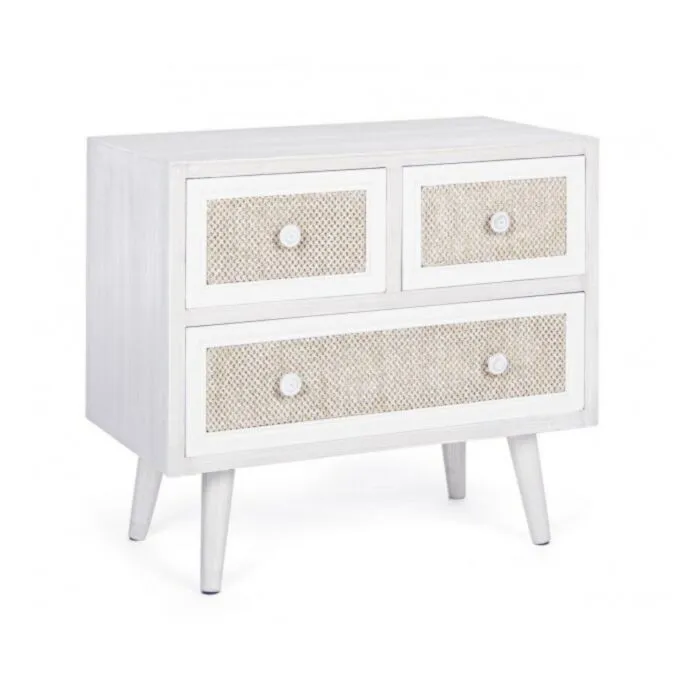 Predalnik 2C-1C MONTIEL je narejen iz MDF-ja, sprednja stran predala je ovlečena v tkanino, noge so iz kovine. Ima poseben in eleganten dizajn, ki popestri vaš prostor.
