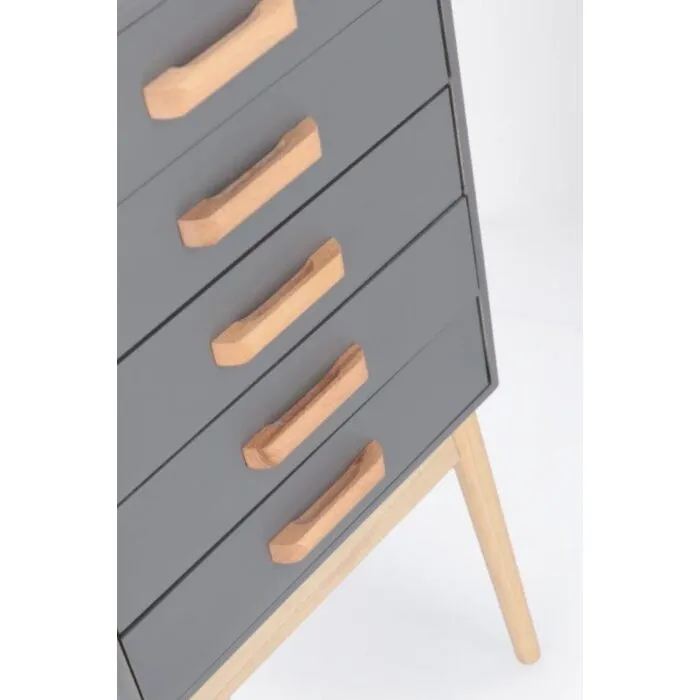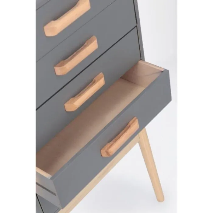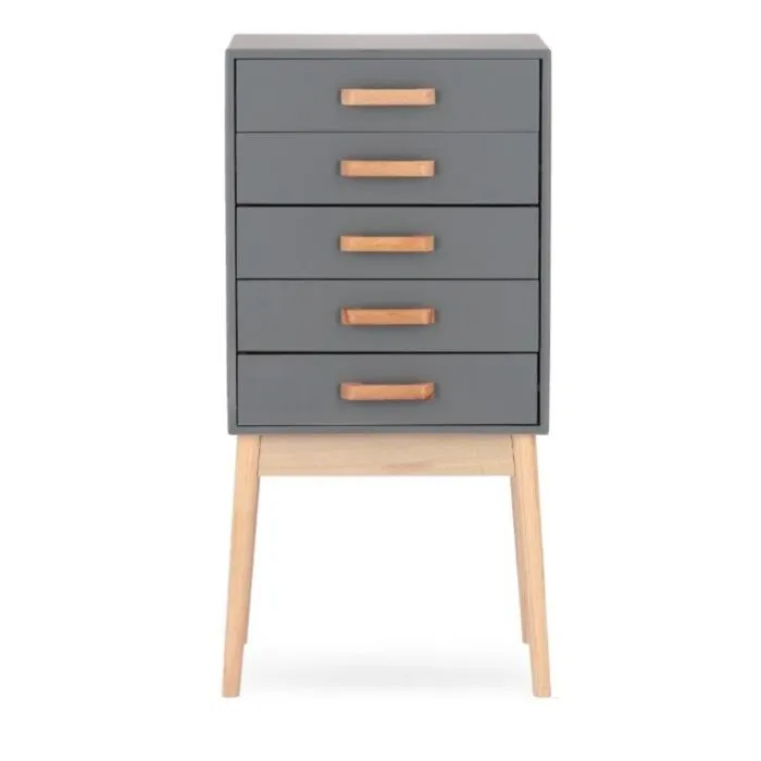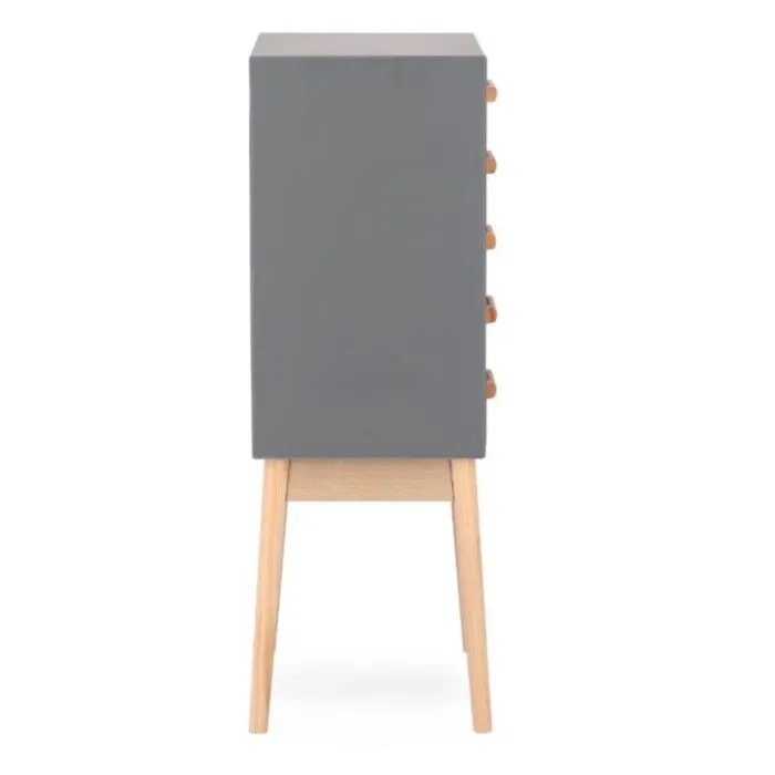 Predalnik ORDINARY 5C siva, je eleganten kos pohištva, ki popestri vaš prostor. Noge so narejene iz borovega lesa z MDF ploščo. Predali so narejeni iz lesa pavlovnije.