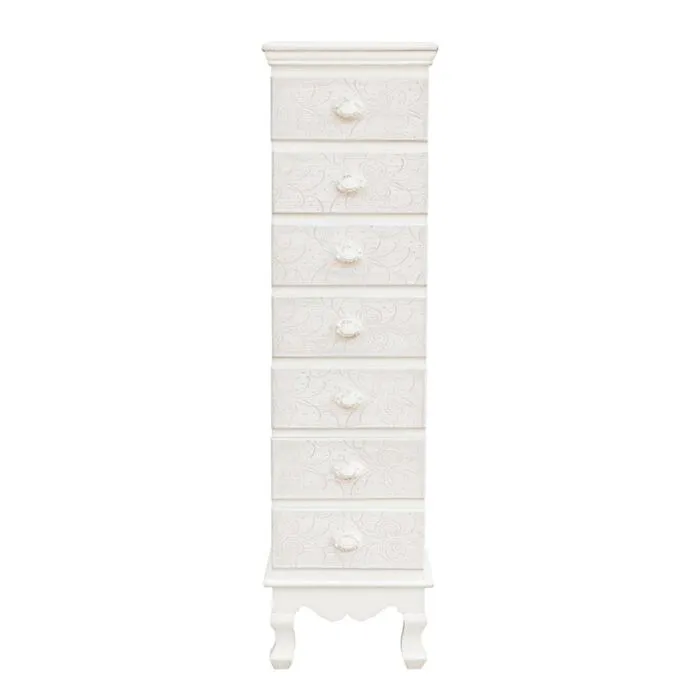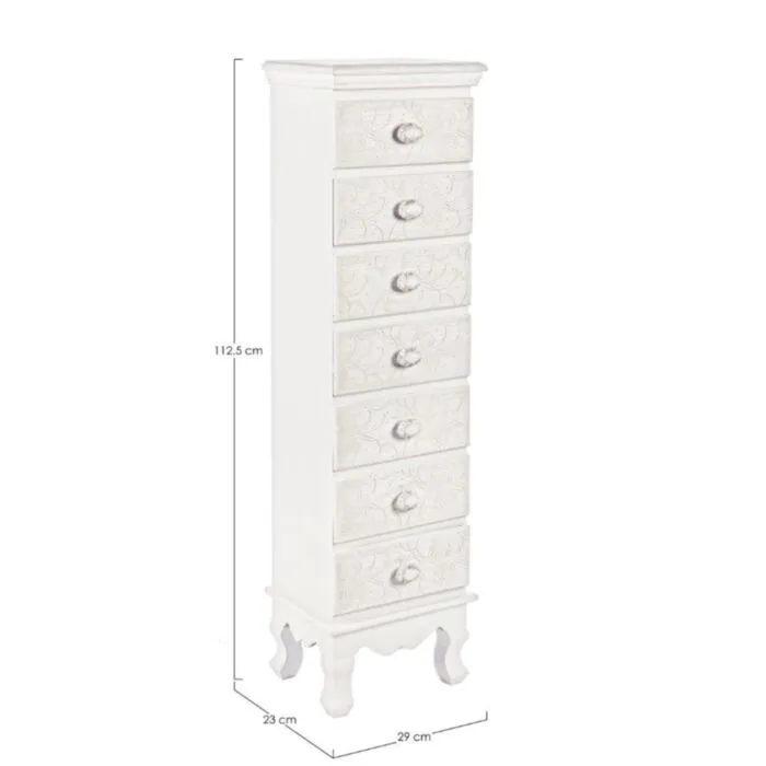 Predalnik 7C CLORIN je eleganten kos pohištva, ki popestri vaš prostor. Njen poseben dizajn vas bo navdušil, saj prinese vašemu prostoru eleganco in prefinjenost. Na voljo je v beli barvi, obogaten z nežnim motivom cvetja, ki dodaja predih elegance in topline.