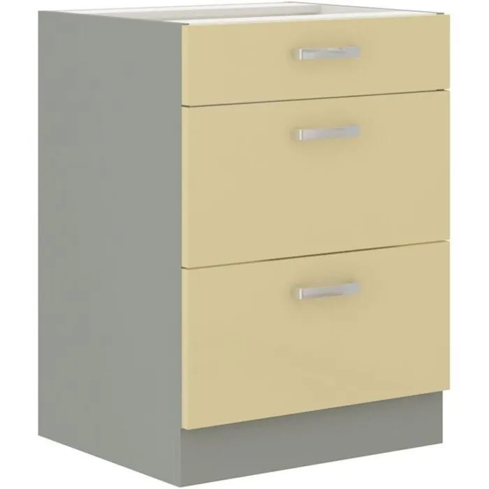 Predalnik ELITE 60D 3P je sestavljen iz fronte iz MDF plošče, debeline 16 mm, robovi so iz ABS 1 mm. Korpus je narejen iz laminirane plošče, debeline 16 mm, robovi so iz melamina. Kuhinjski element je na voljo v treh barvah visokega sijaja. V komentarju dopišete, katero barvno kombinacijo želite. Kuhinjski elementi imajo sistem mehkega zapiranja.