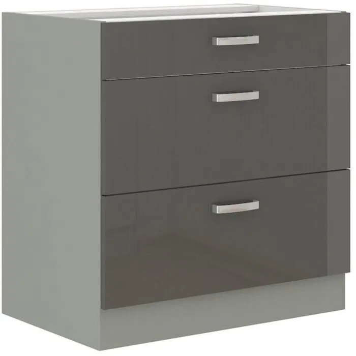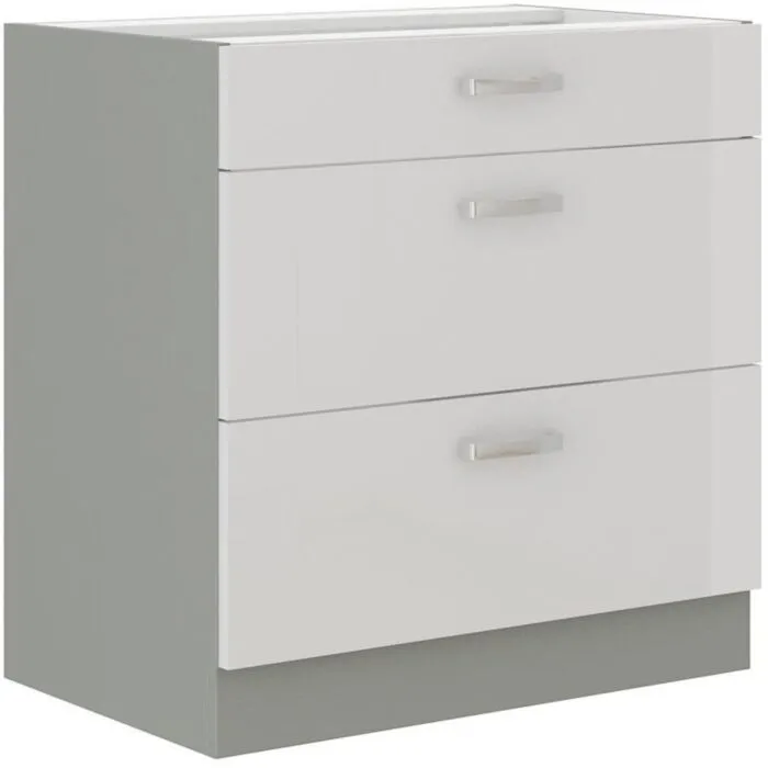 Predalnik ELITE 80D 3P je sestavljen iz fronte iz MDF plošče, debeline 16 mm, robovi so iz ABS 1 mm. Korpus je narejen iz laminirane plošče, debeline 16 mm, robovi so iz melamina. Kuhinjski element je na voljo v treh barvah visokega sijaja. V komentarju dopišete, katero barvno kombinacijo želite. Kuhinjski elementi imajo sistem mehkega zapiranja.