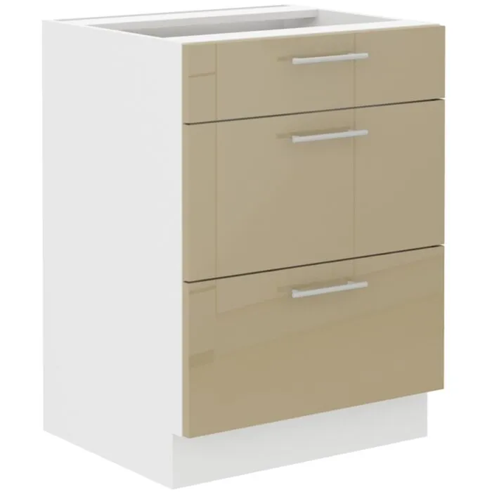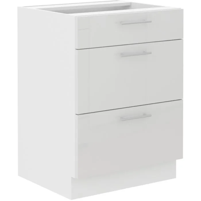 Predalnik ELZA 60D je sestavljena iz predalov iz MDF plošče, debeline 16 mm, robovi so iz ABS 1 mm, ročaji so kovinski debeline 19,2 mm. Korpus je narejen iz laminirane plošče, debeline 16 mm, robovi so iz melamina. Kuhinjski element je na voljo v capuccino barvi visoki sijaj, beli barvi visoki sijaj in sivi barvi visoki sijaj. V komentarju dopišete, katero barvno kombinacijo želite. Kuhinjski elementi imajo sistem mehkega zapiranja.
