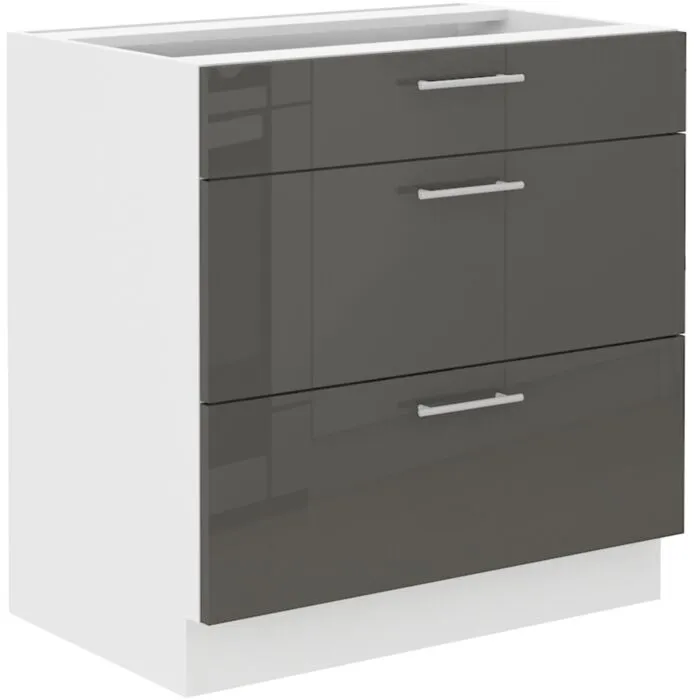 Predalnik ELZA 80D je sestavljena iz predalov iz MDF plošče, debeline 16 mm, robovi so iz ABS 1 mm, ročaji so kovinski debeline 19,2 mm. Korpus je narejen iz laminirane plošče, debeline 16 mm, robovi so iz melamina. Kuhinjski element je na voljo v capuccino barvi visoki sijaj, beli barvi visoki sijaj in sivi barvi visoki sijaj. V komentarju dopišete, katero barvno kombinacijo želite. Kuhinjski elementi imajo sistem mehkega zapiranja.