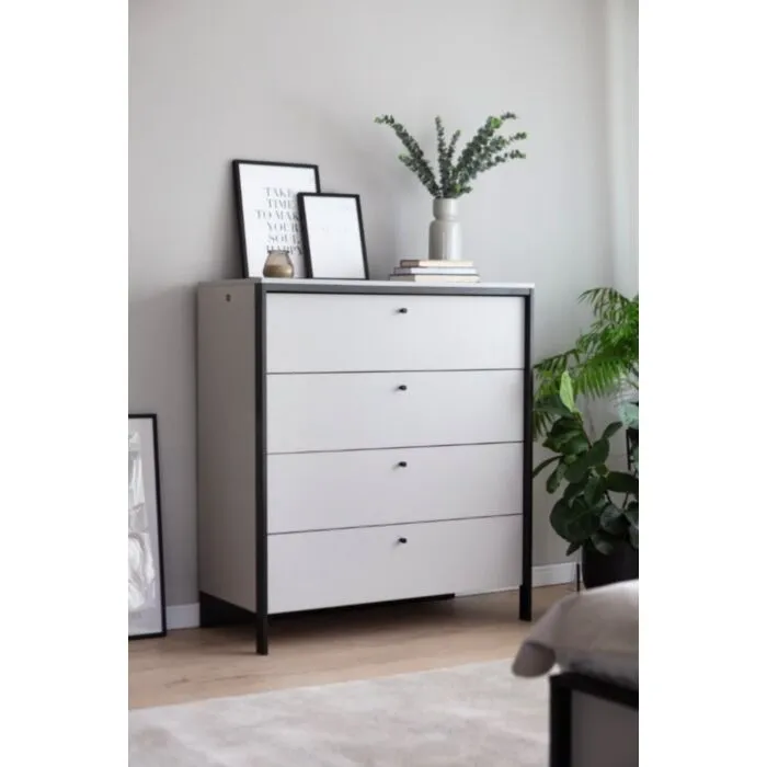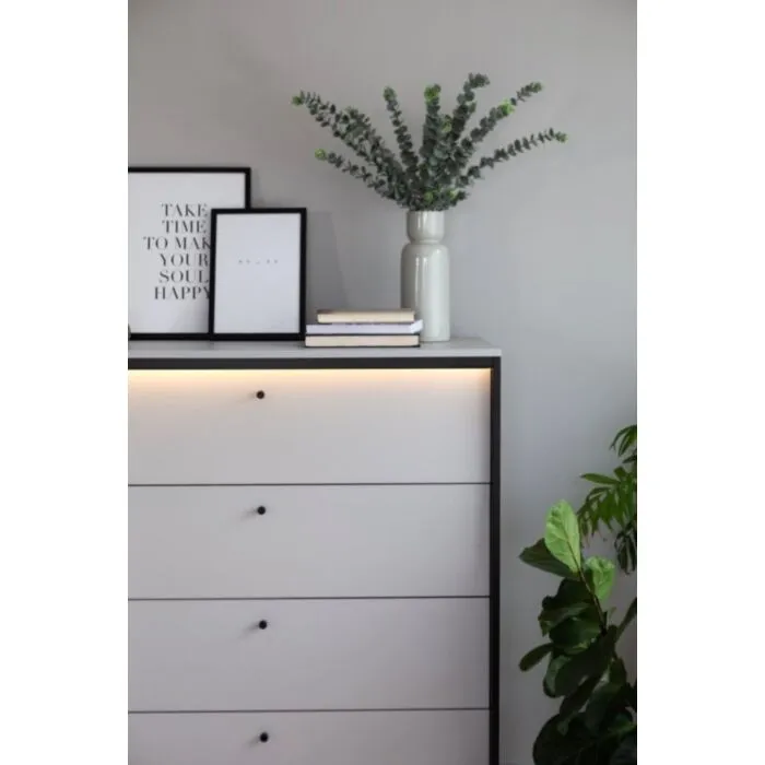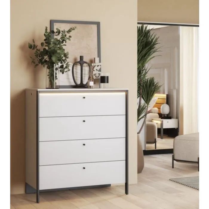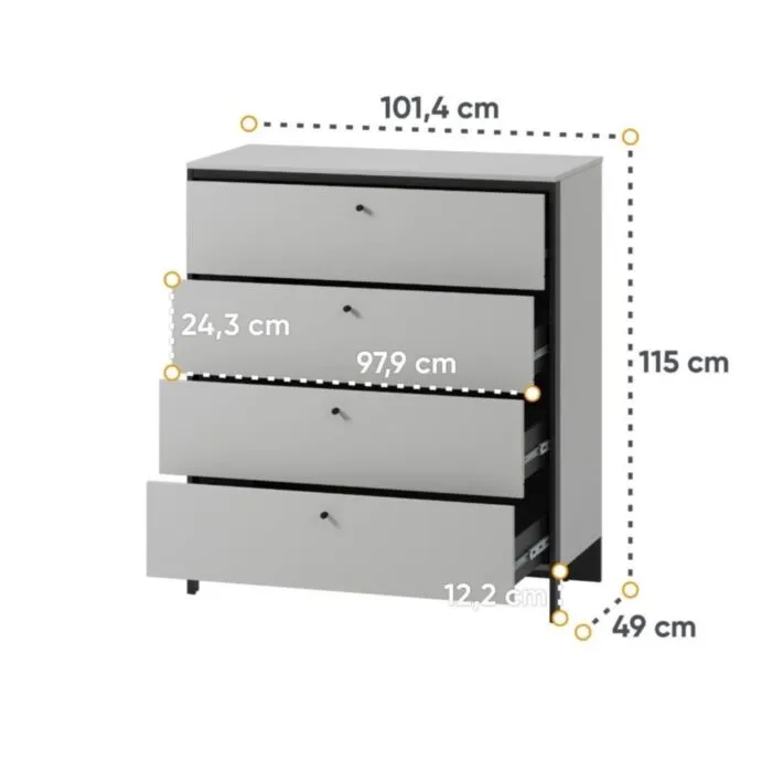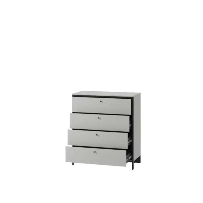 Predalnik GRIZLIN je dvostranski kos pohištva. Lahko jo uporabljate kot komodo ali pa kot predalnik, saj ima kar štiri predale. Zasnovana je kot dodatek za v spalnico, pisarno, dnevno sobo, predprostor ali prostor kjer potrebujete dodatno organizacijo. Komoda ima LED osvetlitev za dodatno eleganco. Narejena je iz laminirane iverne plošče debeline 16 mm. Zaradi svoje oblike in visokokakovostnih materialov je trpežna in vzdržljiva.