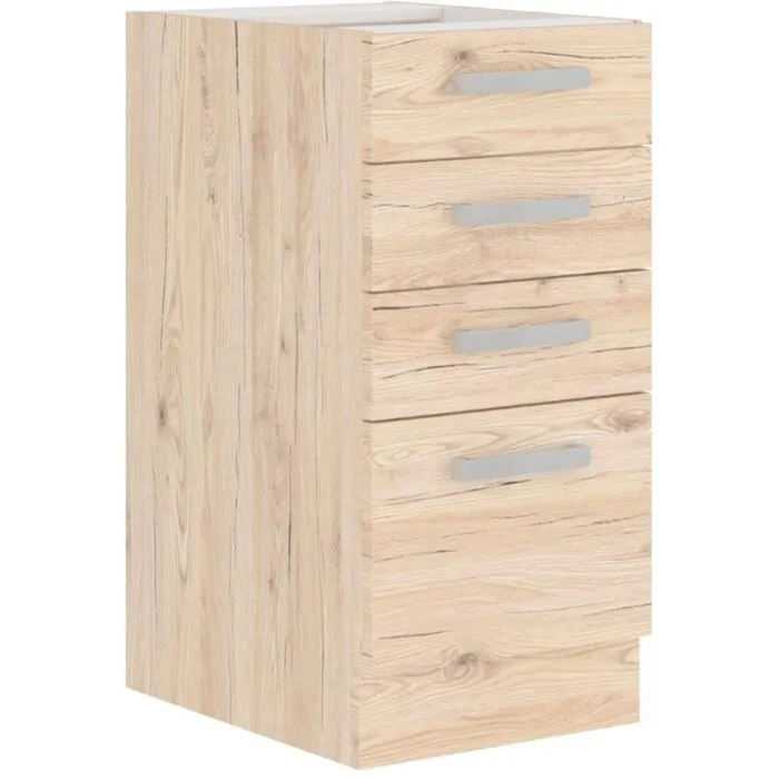 Predalnik SANREMO 40D 4P je sestavljen iz fronte iz MDF plošče, debeline 16 mm, robovi so iz ABS 1 mm. Korpus je narejen iz laminirane plošče, debeline 16 mm, robovi so iz melamina. Na voljo je v barvi hrasta. Kuhinja ima sistem mehkega zapiranja.
