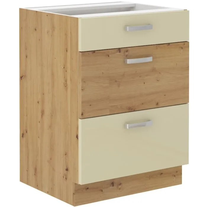 Predalnik TISA 60D 3P fronta je izdelana iz laminirane plošče, debeline 16 mm, robovi so iz ABS 1 mm. Ročaj je iz kovine v sivi barvi. Korpus je narejen iz laminirane plošče, debeline 16 mm, robovi so iz melamina. Kuhinjski element je na voljo v treh barvah visokega sijaja. V komentarju dopišete, katero barvno kombinacijo želite. Kuhinjski elementi imajo sistem mehkega zapiranja.