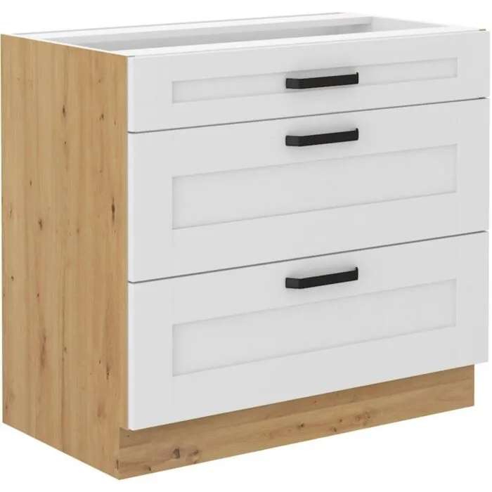 Predalnik VANESA 80D 3P ima tri predale narejen je iz MDF plošče, debeline 16 mm, robovi so iz ABS 1 mm, ročaji pa so iz kovine v črni barvi. Korpus je narejen iz laminirane plošče, debeline 16 mm, robovi so iz melamina. Kuhinjski element je na voljo v beli / hrast barvi in ima mehko zapiranje.