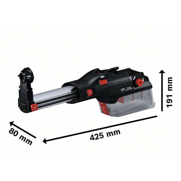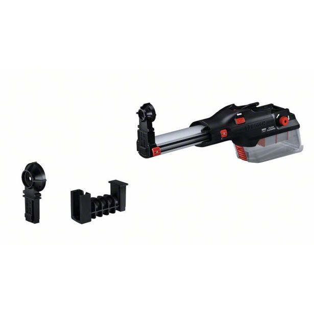 Izjemno lahek odsesovalni nastavek GDE 28 D Professional je zelo kompakten in ergonomski, saj tehta zgolj 0,8 kg. Namestiti ga je mogoče s preprostim klikom in tudi praznjenje posode za prah poteka preprosto, brez odstranjevanja filtra. Opremljen je z mehanizmom za čiščenje HEPA-filtra, ki omogoča konstanten pretok zraka in izjemno učinkovito odvajanje prahu. Dva izmenljiva nastavka omogočata vrtanje do premera 28 mm in dolžine 265 mm s podaljškom, kar zajema širok spekter uporabe. Ta nastavek za odsesavanje je primeren za običajno ali udarno vrtanje z vrtalnim kladivom GBH 18V-28 DC Professional.