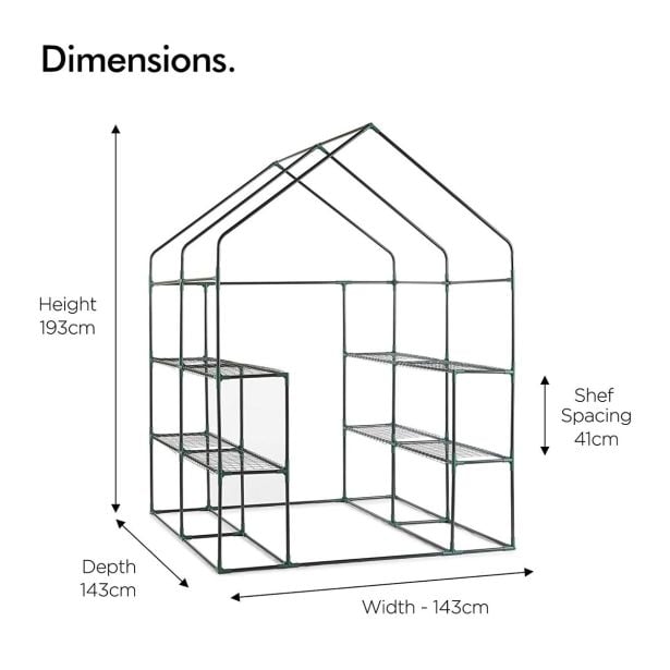 Okvir rastlinjaka je sestavljena iz prašno barvanih kovinskih cevi, ki so med seboj povezane z močno plastiko. Okvir je pokrit z ojačano folijo, vrata z zadrgo pa je mogoče zviti za preprost dostop in ustrezno prezračevanje.