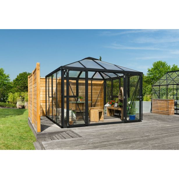Rastlinjak Fortuna se zaradi svoje posebne oblike, kot je streha paviljona, popolnoma prilega vašemu vrtnemu raju. Zahtevni vrtnarji in rastline imajo koristi od visokokakovostne opreme, na primer z dobro izolativno streho iz votlih stenskih plošč, 3 stranskimi okni, ki zagotavljajo odlično prezračevanje, in visokimi stranskimi stenami, ki zagotavljajo veliko prostora za rast in cvetenje. Na 10,2 m2 tlorisne površine bodo zaradi 1,88 m visokih stranic in 2,65 m visokega slemena rastline in hobi vrtnarji našli dovolj prostora za razvoj. Široka dvokrilna vrata, ki jih je mogoče na široko odpreti, poudarjajo vtis prostornosti. Obe vratni krili je mogoče zakleniti, ko sta odprti: to zagotavlja prost vstop in izstop, tudi če imate v rokah velike predmete. Dvojni okvirni profili ob straneh stabilno in brez nadležnih pripomočkov, kot so vzmetne sponke, po vsej dolžini objamejo velika stekla iz kristalno čistega varnostnega stekla (ESG). Poleg tega Fortuna navdušuje s svojim domačim značajem: stranice iz kristalno čistega varnostnega stekla (ESG) omogočajo pogled na vrt in rastlinjak. Tri stranska okna ter vratna kljuka iz nerjavečega jekla in visokokakovostna cilindrična ključavnica z možnostjo zaklepanja dajejo zeleni oazi domač pridih. Nadaljnje podrobnosti razkrivajo, da je bil mali raj do potankosti premišljen glede uporabe: žlebovi in ??odtočne cevi omogočajo zbiranje dragocenosti
