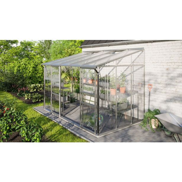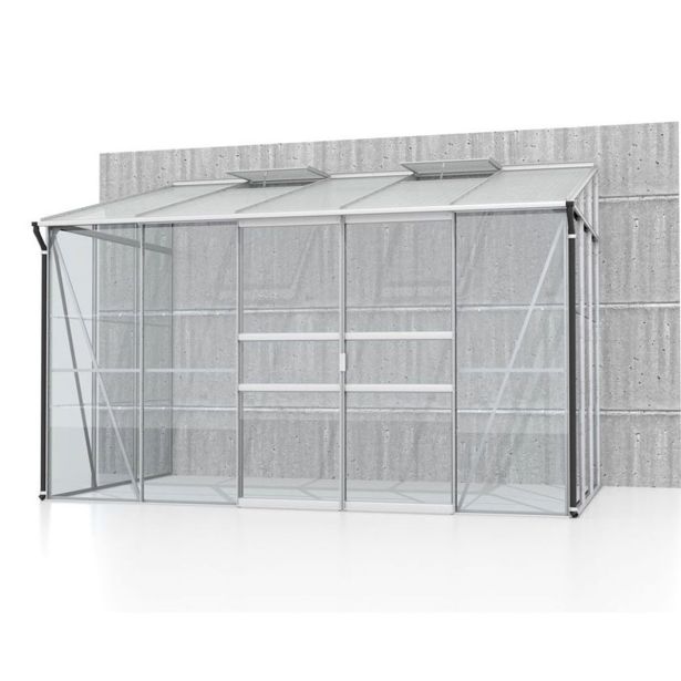 Komplet za prislonjen rastlinjak iz anodiziranih aluminijastih profilov in zasteklitve s kristalno čistim varnostnim steklom na straneh in UV-stabiliziranimi votlimi komornimi ploščami (PC) v strehi. Artikla ni mogoče postaviti samostojno.