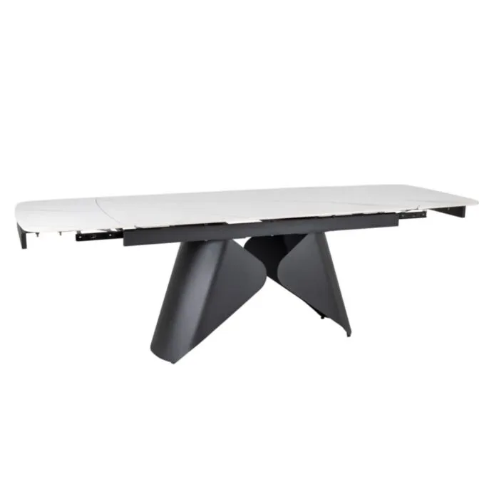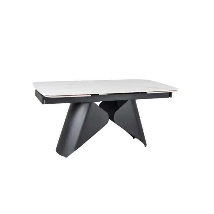 Raztegljiva jedilna miza ARMANO je narejena do podrobnosti natančno. Očarali vas bodo njeni prefinjeno narejeni vzorci ter stabilnost. Narejena je iz kakovostne keramike v beli mat barvi, v videzu marmorja. Okvir je narejen iz kovine v črni mat barvi. Miza je raztegljiva.