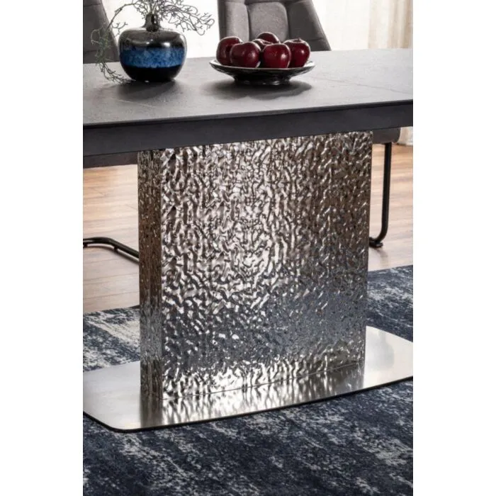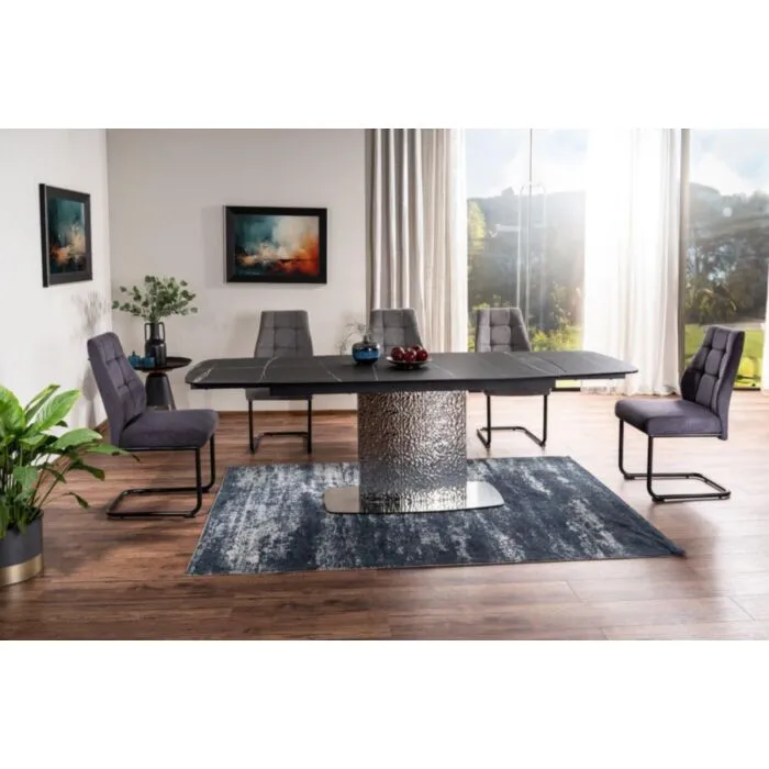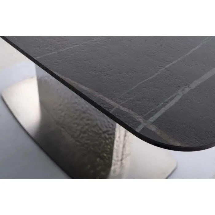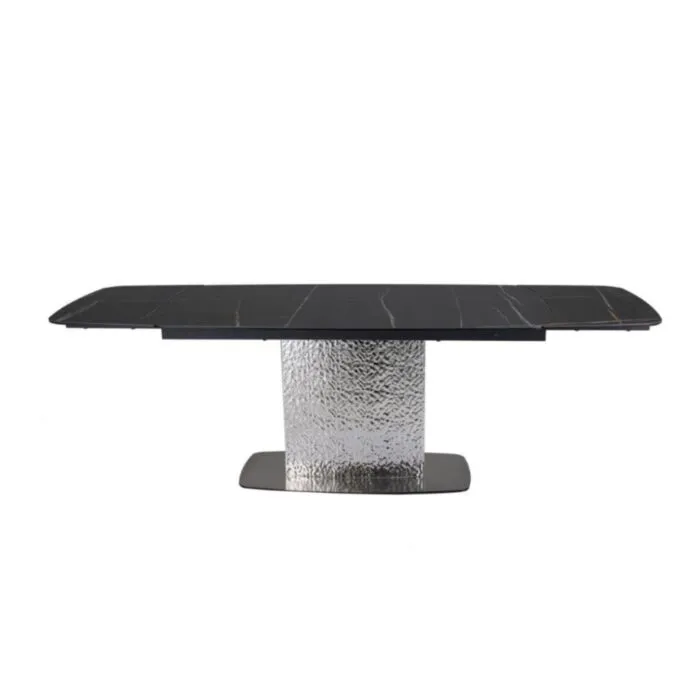 Raztegljiva jedilna miza ASH, je eleganten kos pohištva. Mizna plošča je narejena iz kaljenega stekla in italijanske keramike v črni mat barvi. Podnožje mizne plošče je narejeno iz nerjaveče kovine v krom barvi. S svojim dizajnom in obliko popestri vaš prostor.