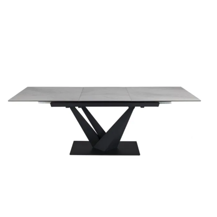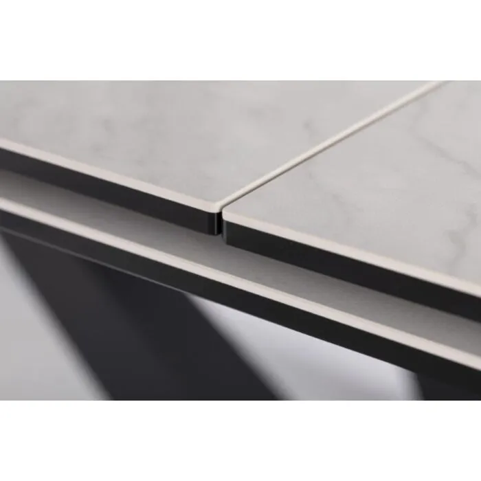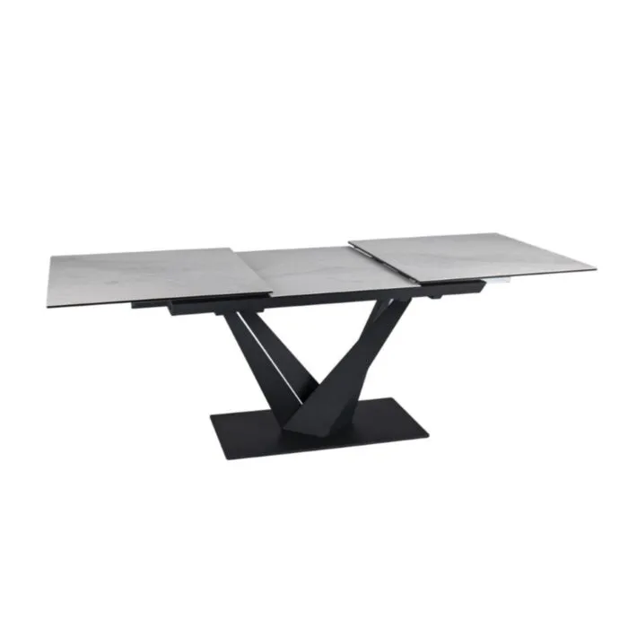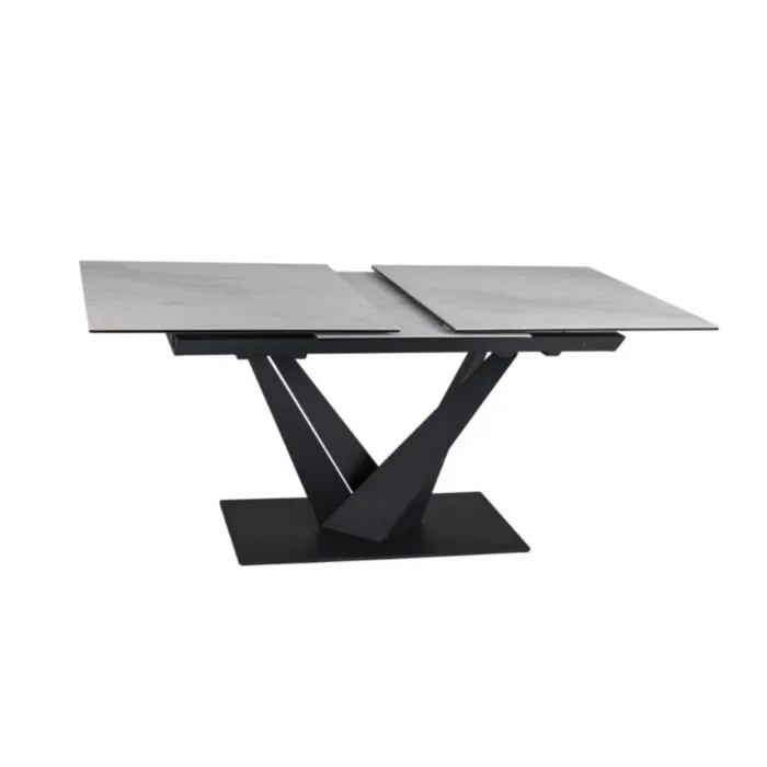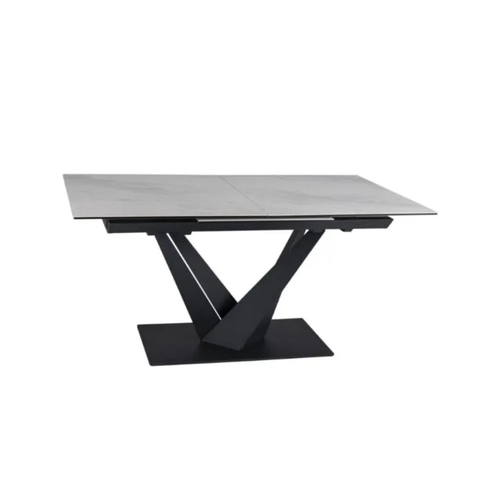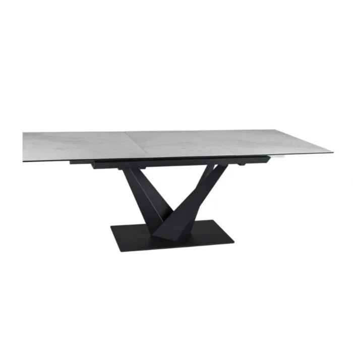 Raztegljiva jedilna miza KIJARA, bo prinesla svežino in eleganco v vaš prostor. Narejena je iz kakovostnega kaljenega stekla in španske keramike. Ogrodje je narejeno iz kovine. Ogrodje je v črni mat barvi, mizna plošča je v beli mat barvi z videzom marmorja. S svojo obliko in barvo popestri vsak prostor.