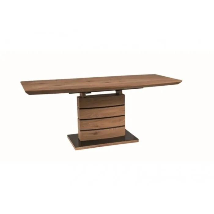 Raztegljiva jedilna miza LEONE je modernega dizajna. Dobavljiva v hrast barvi. Miza je kvalitetna, mizna plošča je izdelana iz MDF- ja in furnirja v hrast barvi. Ogrodje pa je izdelano iz MDF- ja in inoxa prav tako v hrast barvi. Miza je raztegljiva.