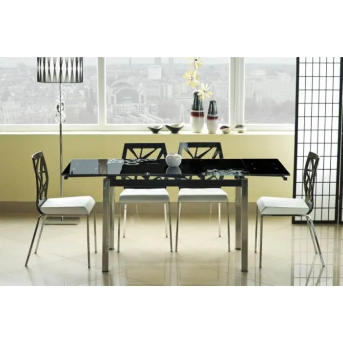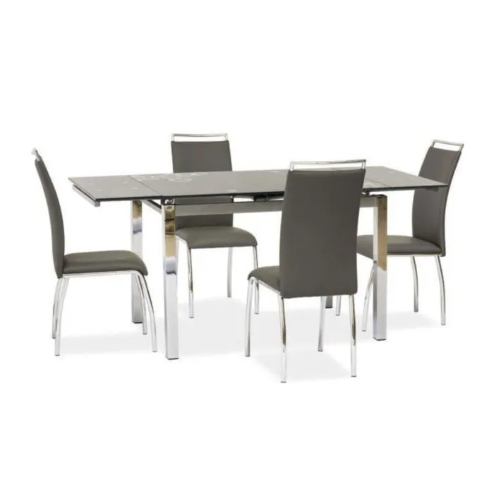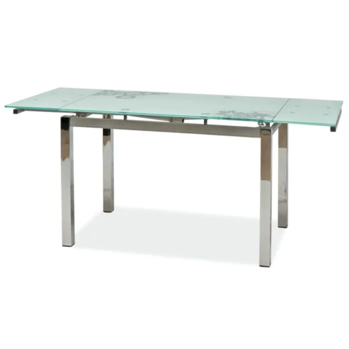 Raztegljiva jedilna miza MILA v kombinaciji kaljenega stekla in kovine v krom barvi, bo prinesla svežino v vaš prostor. Miza je narejena iz kakovostnih materijalov. Steklo ima vzorce.