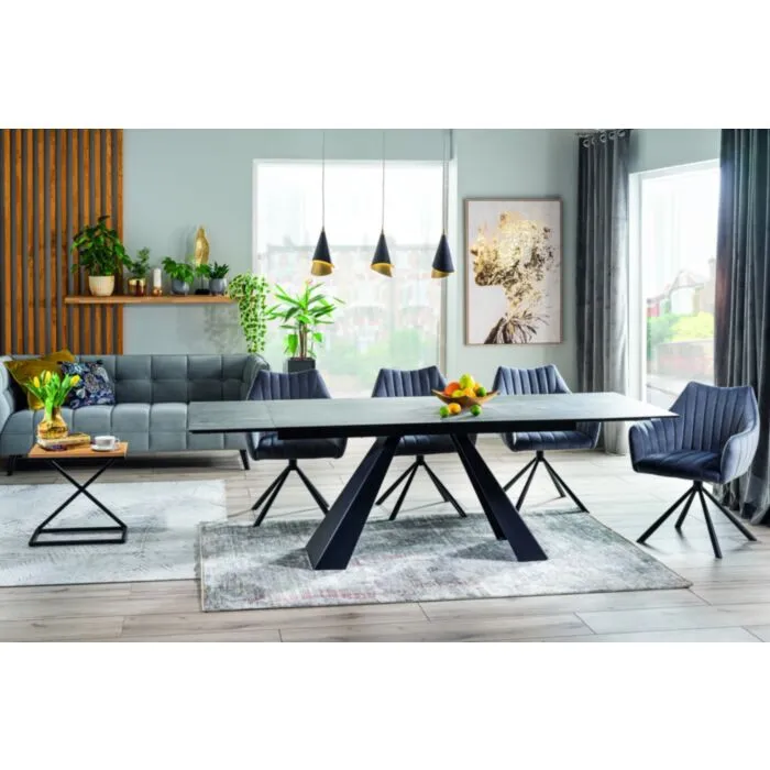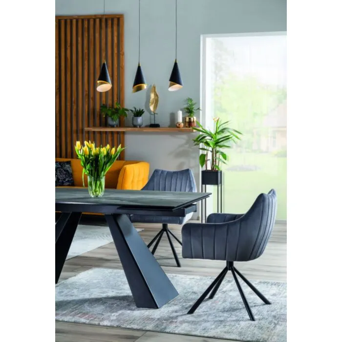 Moderna miza SALVADOR predstavlja praktičnost in sodobni pristop k ureditvi jedilnega prostora. Mizna plošča je narejena iz kaljenega stekla in italijanske keramike sivega marmorja. Podnožje mizne plošče je iz kovine in MDF v črni barvi. K mizi se lepo podajo stoli KULISA.