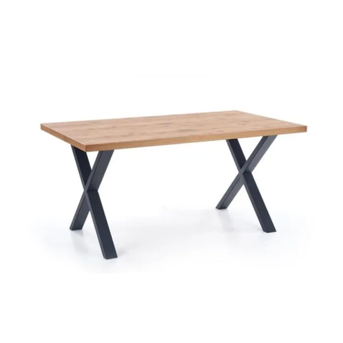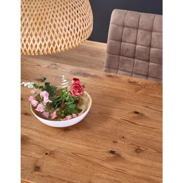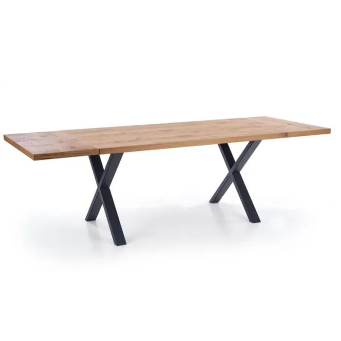 Raztegljiva jedilna miza SAVI je kakovostna jedilna miza, ki se podaljša za kar 90 cm. V vašem domu vam nikoli več ne bo zmanjkalo prostora za obiske. Mizna plošča je izdelana iz furnirja z robovi iz masivnega lesa, v barvi svetlega hrasta. Noge so izdelane iz kovine v črni barvi.