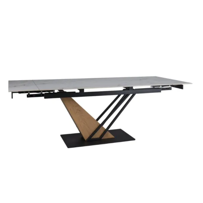 Raztegljiva jedilna miza SOKOL 180 je narejena iz keramike, z efektom belega marmorja. Ogrodje je izdelano v kombinaciji kovine in MDF – ja s furnirjem, v črmi mat in hrast barvi. S svojo obliko in eleganco popestri vsak prostor ter je praktična za uporabo, saj je raztegljiva.