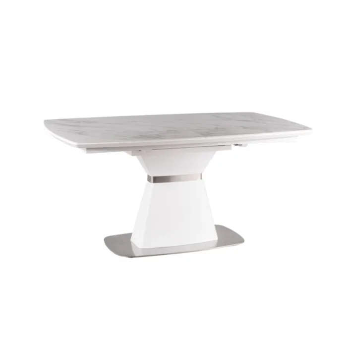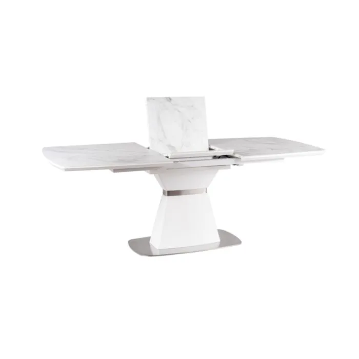 Raztegljiva miza KARA marmor, navdaja vaš jedilni prostor s svežim belim marmorjem in prefinjenostjo. Mizna plošča je izdelana iz MDF – ja in keramike v beli mat barvi videz marmorja. Ogrodje je izdelano iz MDF – ja in jekla v beli mat barvi s krom detajli. Miza je raztegljiva.