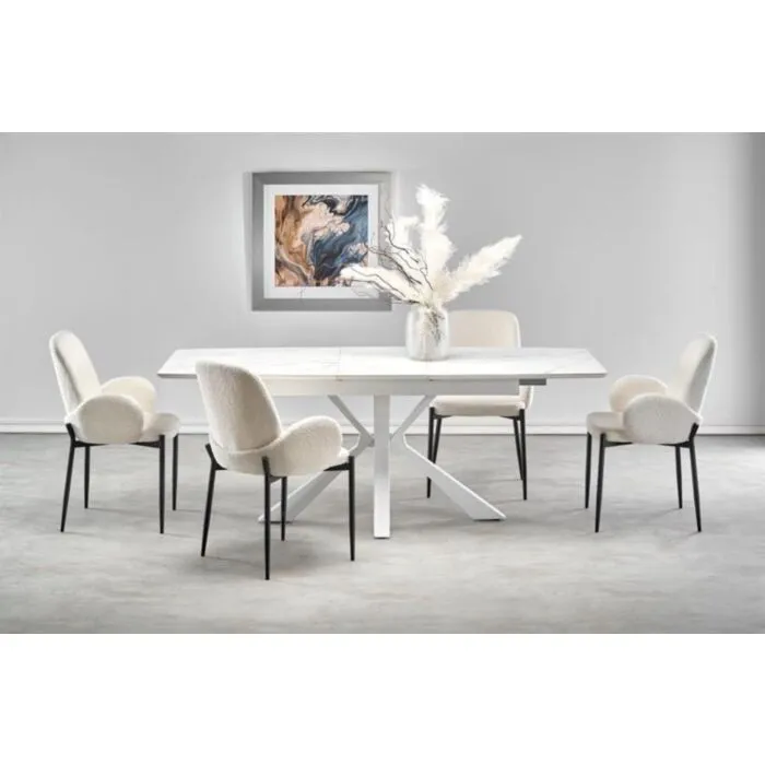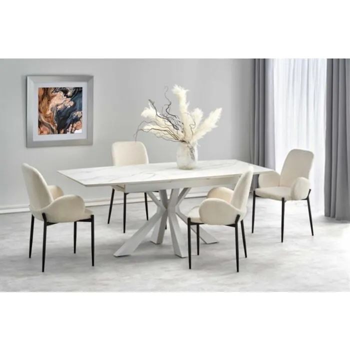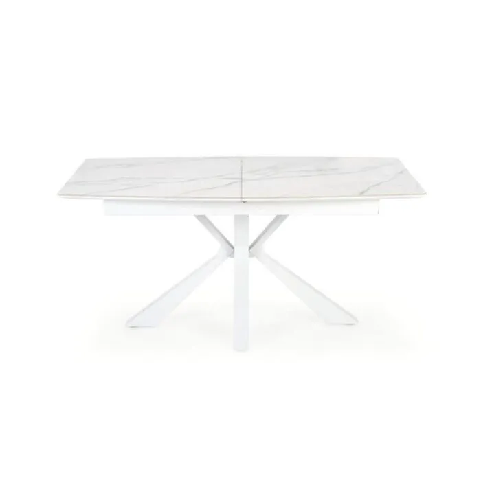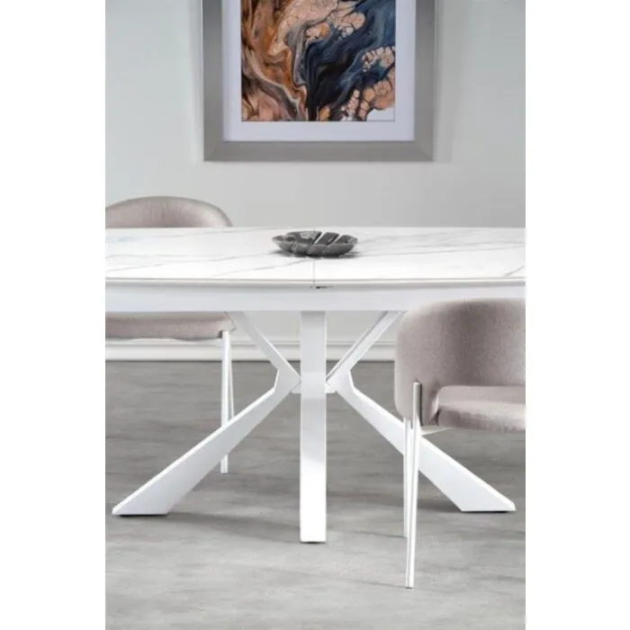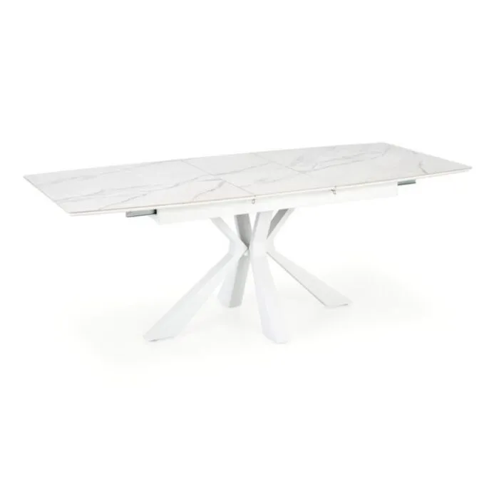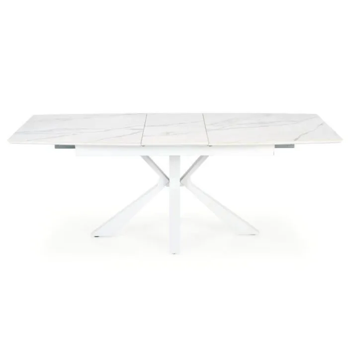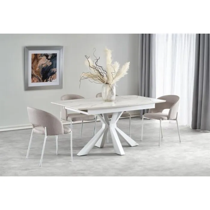 Raztegljiva miza ZARAv kombinaciji belega marmorja in bele barve, popestri vsak prostor. Mizna plošča je narejena iz sintran kamna. Sintran kamen je zmogljiv material, ki izkazuje lastnosti, kot so odpornost na praske, madeže, vročino in UV svetlobo. Noge so narejene iz kovine.
