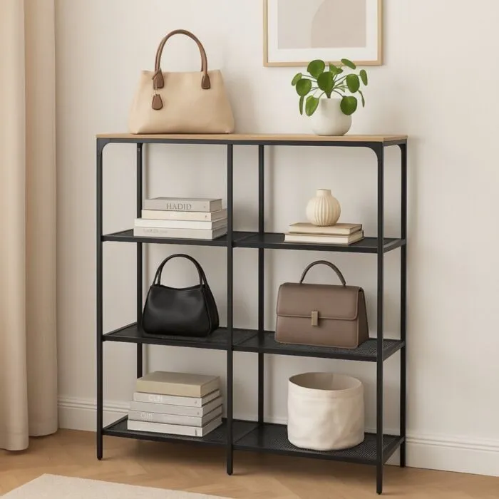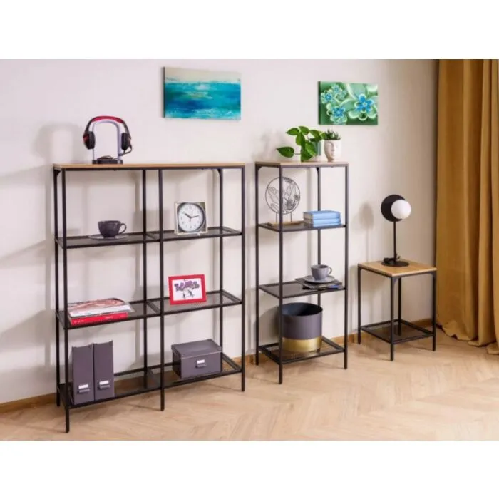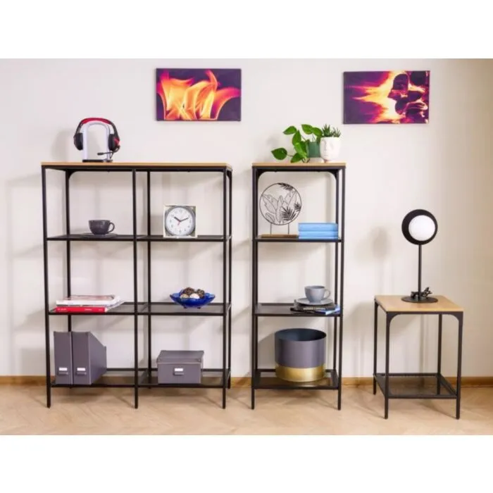 Regal KAI, je eleganten in kakovosten kos pohištva. Narejen je iz laminirane plošče, ogrodje je narejeno iz kovine. S svojo obliko je zelo priročen. Je v črni mat barvi s kombinacijo hrasta. Zaradi svoje oblike in visokokakovostnih materialov je trpežna in vzdržljiva. Odporna je na praske, udarce in obrabo. Je enostavna za vzdrževanje, saj je površina preprosta za čiščenje in negovanje. Estetsko se poda v vsak prostor ter ima dobro odpornost na madeže in vlago.