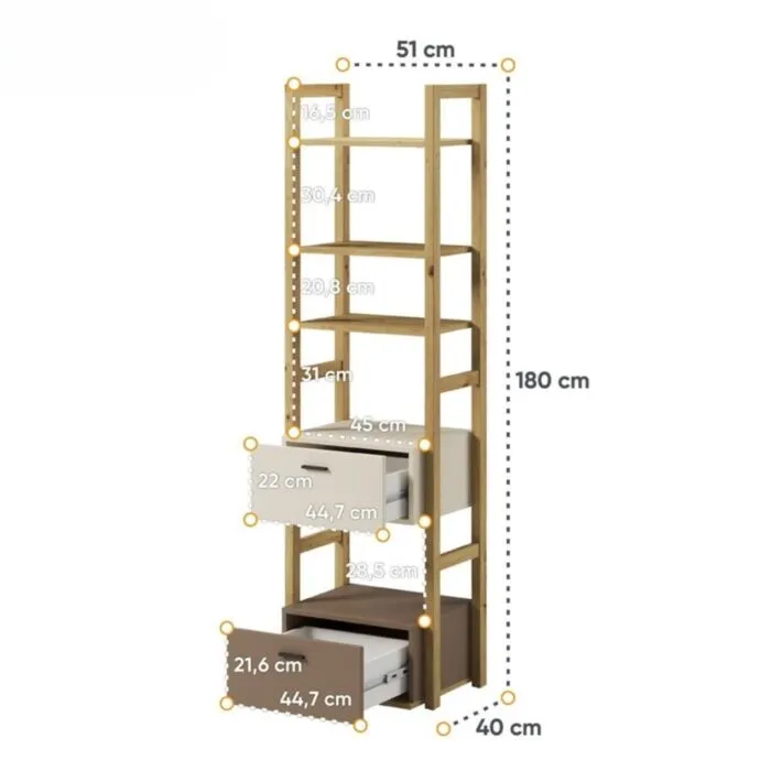 Regal LENI 2 z kar petimi policami in dvemi predali je praktičen in univerzalen. Združuje sodoben slog s funkcionalnostjo. Svetla barva doda čar in daje ceolotni notranjosti edinstven videz. Na voljo je v barvi bež v kombinacije hrast in rjave. Narejena je iz visokokakovostne laminirane plošče debeline 16 mm.