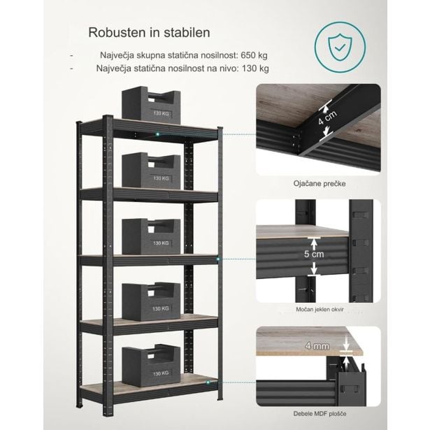jekleni okvir in police iz MDF zagotavljajo močno oporo, ojačitve na nogah in prečke pod vsako stopnjo police pa povečujejo stabilnost. Prašni premaz je odporen na rjo in obrabo. Vsaka polica prenese obremenitev do 120 kg. Razdalja med posameznimi stopnjami police je nastavljiva. Polico lahko razdelite tudi na dva dela. Edinstven videz te odlagalne police doda dekorativni pridih vaši dnevni sobi, balkonu, pisarni ali kuhinji.