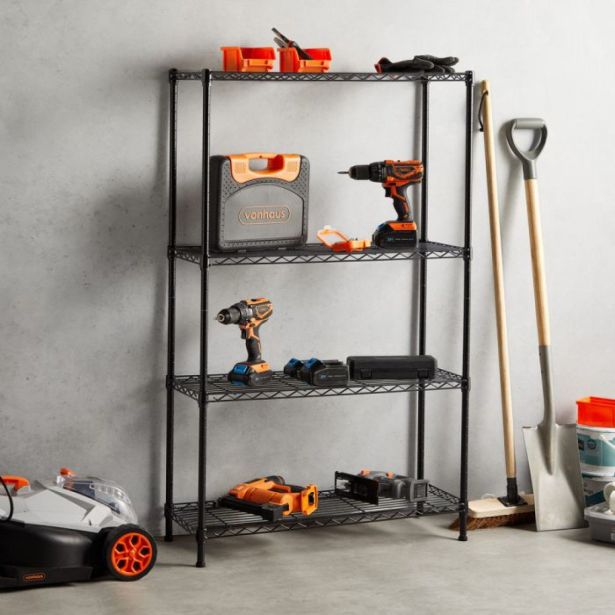VonHaus 4-stopenjski žični regal: Organizirajte svoj prostor s trdnimi žičnimi policami iz jekla. Vsaka polica nosi do 100 kg in je prilagodljiva po višini. Prezračena zasnova omogoča enostavno čiščenje. Popolno za delavnice, pisarne in garaže.