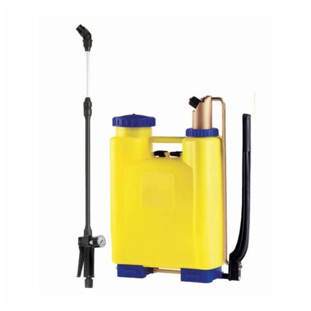 Tlačni razpršilnik v obliki zaobljene kocke s prostornino 12 l. Razpršilnik je rumene barve s črnim nastavkom za pršenje, srebrno cevjo, modrimi nogami in vijačnimi pokrovi. Povezava med razpršilno in tlačno cevjo je kovinska. Trak se pritrdi na vnaprej pripravljena mesta. Tekočino za nanašanje je mogoče enostavno vliti skozi 10 cm široko odprtino. Ročica za pršenje je na strani pršilnika služi tudi kot naprava za uravnavanje tlaka s tlakom 3 barov. Tlak lahko hitro sprostite z ventilom. Razpršilno roko je enostavno upravljati. Šobo lahko priročno nastavite, da uravnate silo in hitrost pretoka tekočine. Dimenzije: v: 39 cm x h: 53 cm x š: 15 cm.