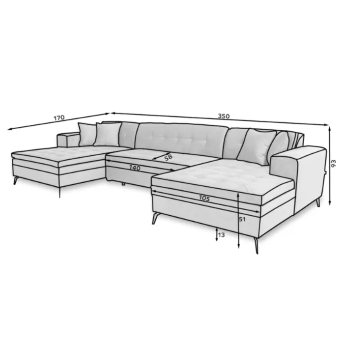 – D: 350 cm x G: 170 cm x V: 93 cm