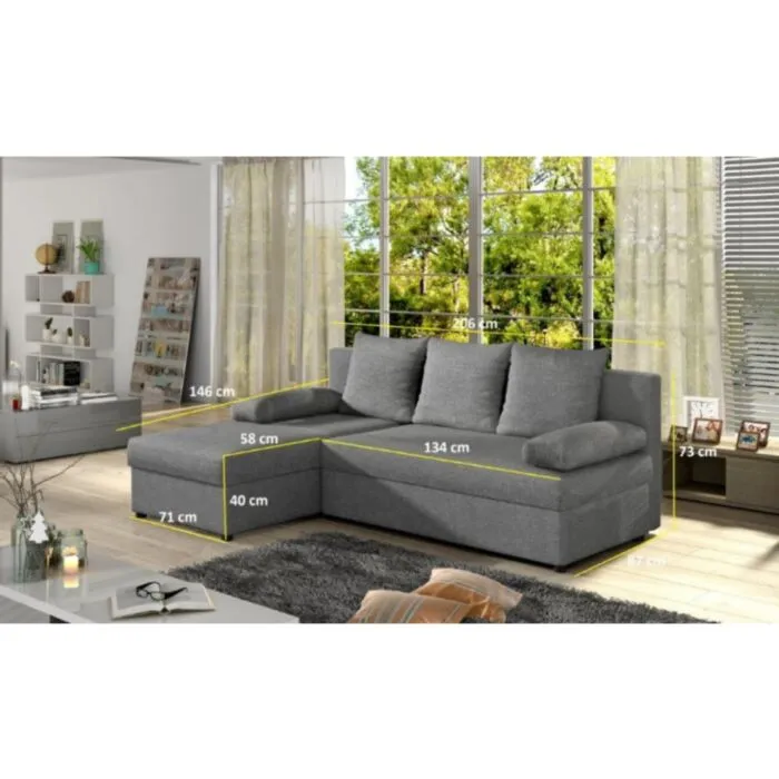 Sedežna garnitura GINA je kotna sedežna garnitura izjemne kvalitete po ugodni ceni. Sedežna ima tudi pomožno ležišče ter predal. Sedežna garnitura je univerzalna, zato vam ni potrebno posebej določiti kota.