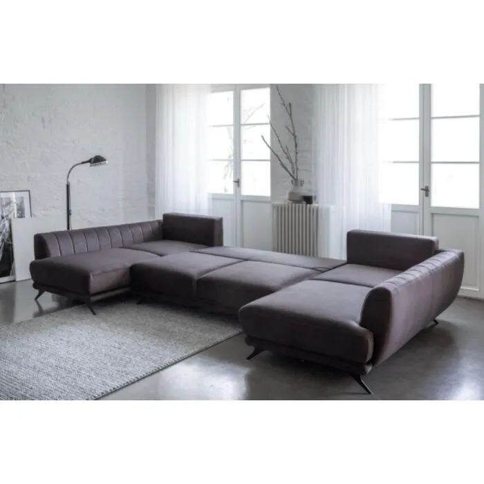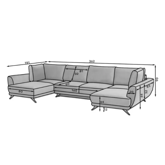 Sedežna garnitura OLIVIA v obliki črke U – eleganten in moderen kos dnevnega pohištva. Sedežna je vzmetena z valovitimi vzmetmi v kombinaciji z visoko elastično peno. Sedežna se raztegne v ležišče ter ima zaboj za shranjevanje. Garnitura je univerzalna zato jo lahko postavite levo ali desno.